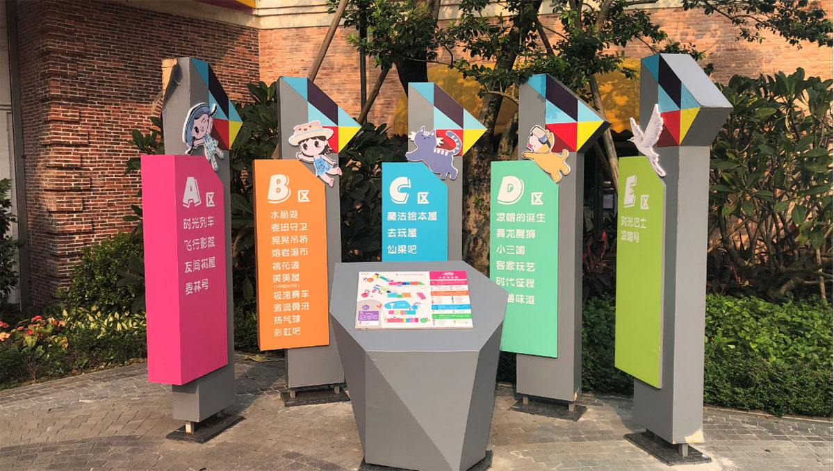 它主要起到传达信息,导视、指标及公示 连接不同区域,起到过渡作用;美化、丰富空 间环境,填补视觉空白等作用。在制作时,我们一般会根据客户提供的效果文件进行规划,在实现外观效果的前提下设计导视牌结构,使它便于制作,同时结构更牢固,便于检修,保障使用寿命。
