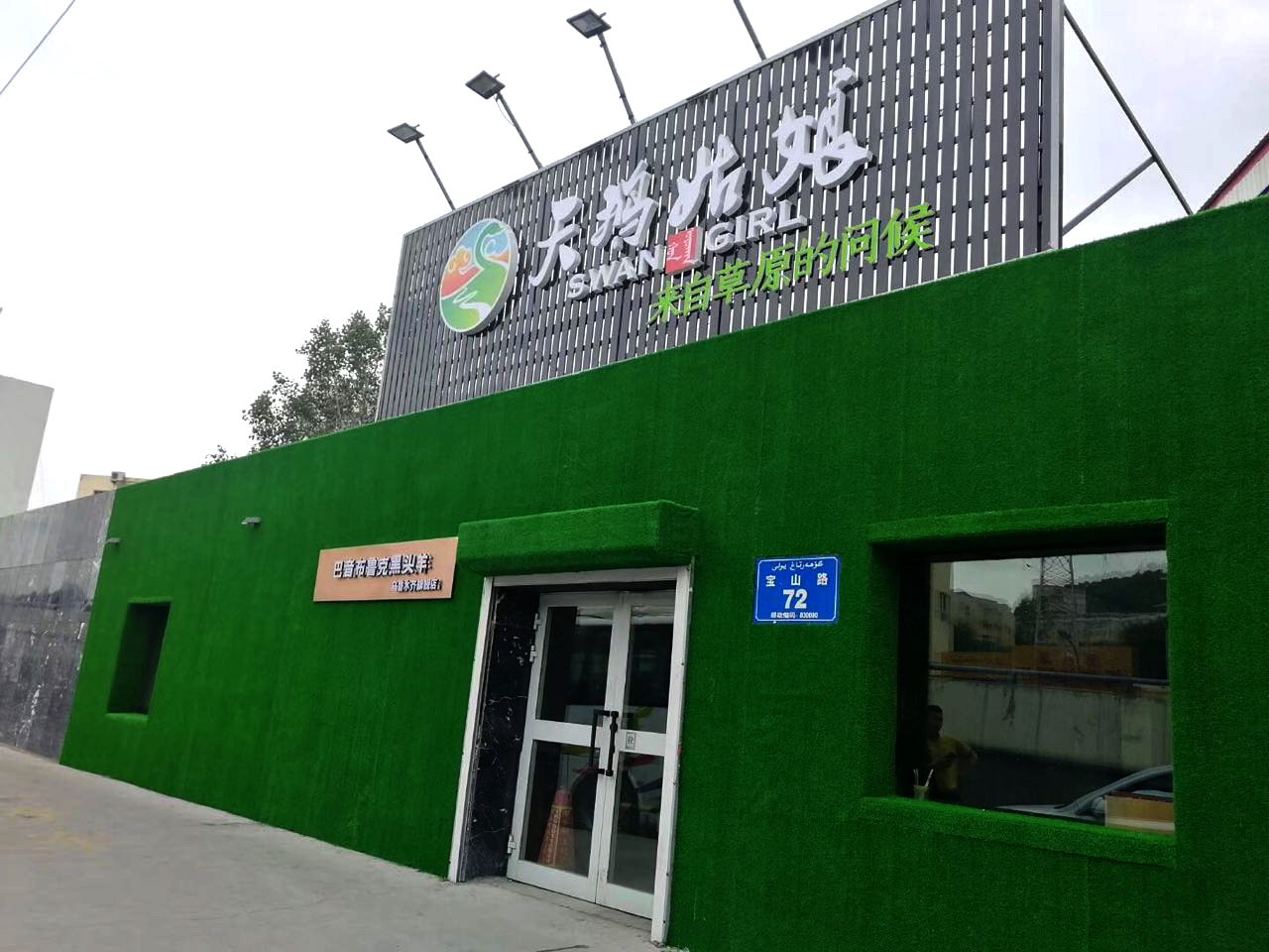 2018年6月16号我公司为****公司制作一整套门头,门头采用超高亮度的无边大字,背景墙背用发光效果好,户内外都可以使用的3D发光字,完美的用绿植物墙面将巴音布鲁克草原的广阔风景带到我们这片繁华的大都市。也更好的诠释了贵公司的产品。逼真绿植墙门头效果将不由自由的吸引客户前来一探究竟。